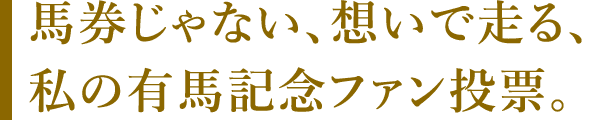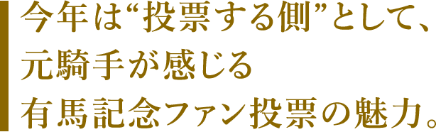 日々競馬を嗜んでいる人にとっての有馬記念は、自分の応援している“推し馬”あるいは“推しジョッキー”の晴れ姿を見る年末の最後のお楽しみではないでしょうか。しかし有馬記念がすごいのは、普段は競馬をやらない人たちに「観てみようかな」「これだけは馬券を買ってみよう」と思わせるところ。誰にとっても最高の祭典なのです。それをさらに特別なものにするのが『有馬記念ファン投票』です。私も競馬を始めて6年ほど経ちますが、毎年投票しています。